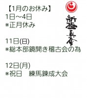 【1月のお休み】1日~4日※正月休み11日(日)※総本部鏡開き稽古会の為12日(月)※祝日 練馬錬成大会